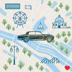 Die Grafik zeigt ein Auto vor einer Hamburg-Karte mit integrierten Sehenswürdigkeiten, alles in orangefarbenen Tönen gehalten